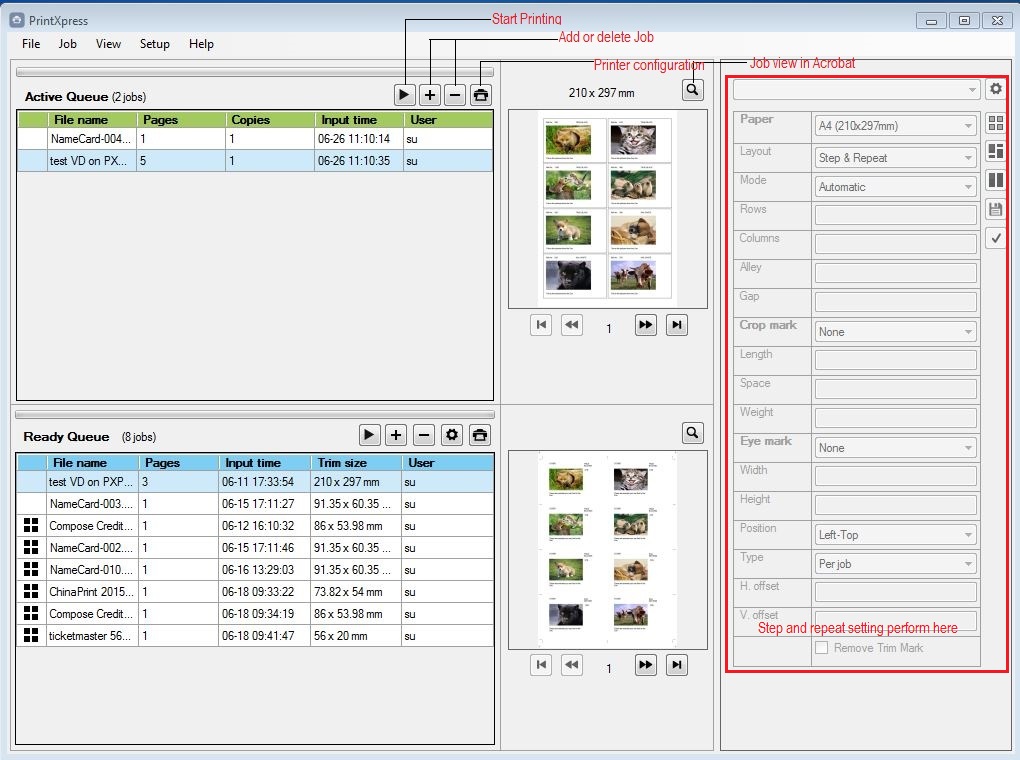 - The Ready Queue prepares jobs for printing—for example, arranging multiple name cards on a sheet to optimise paper usage.